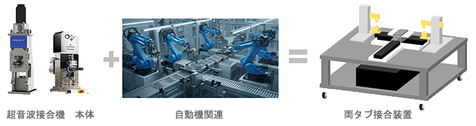 その一例を紹介させていただきます。Ex >超音波溶接機+搬送系=タブ接合装置